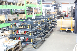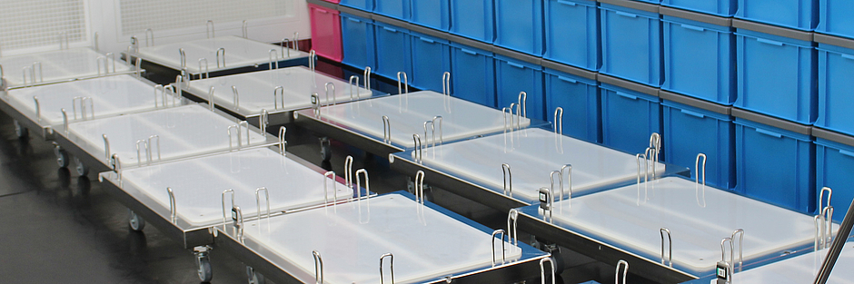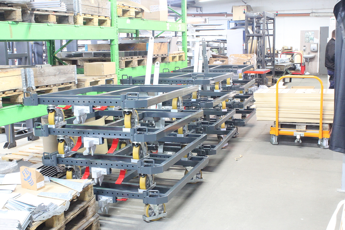 - Optionale Anpassung der Abmessungen, der Art der Stellflächenabdeckung sowie der Ausführung der Räder
